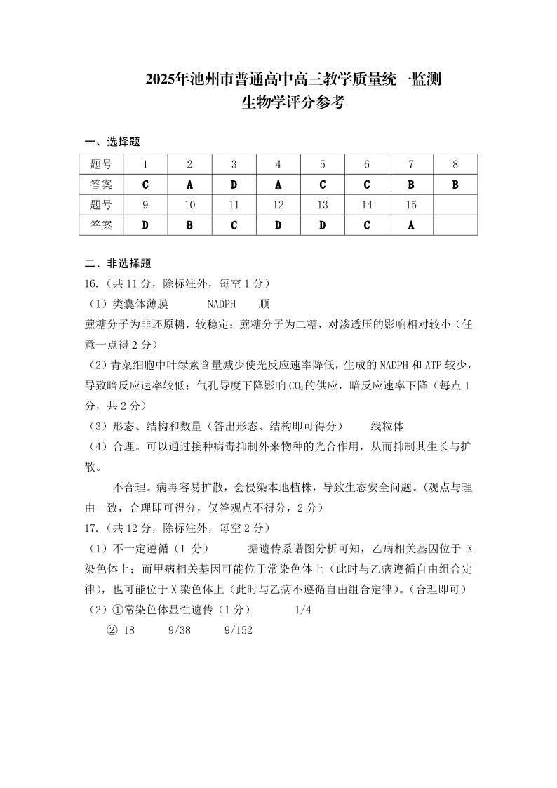 2025年池州市普通高中高三教学质量统一监测 生物答案.pdf