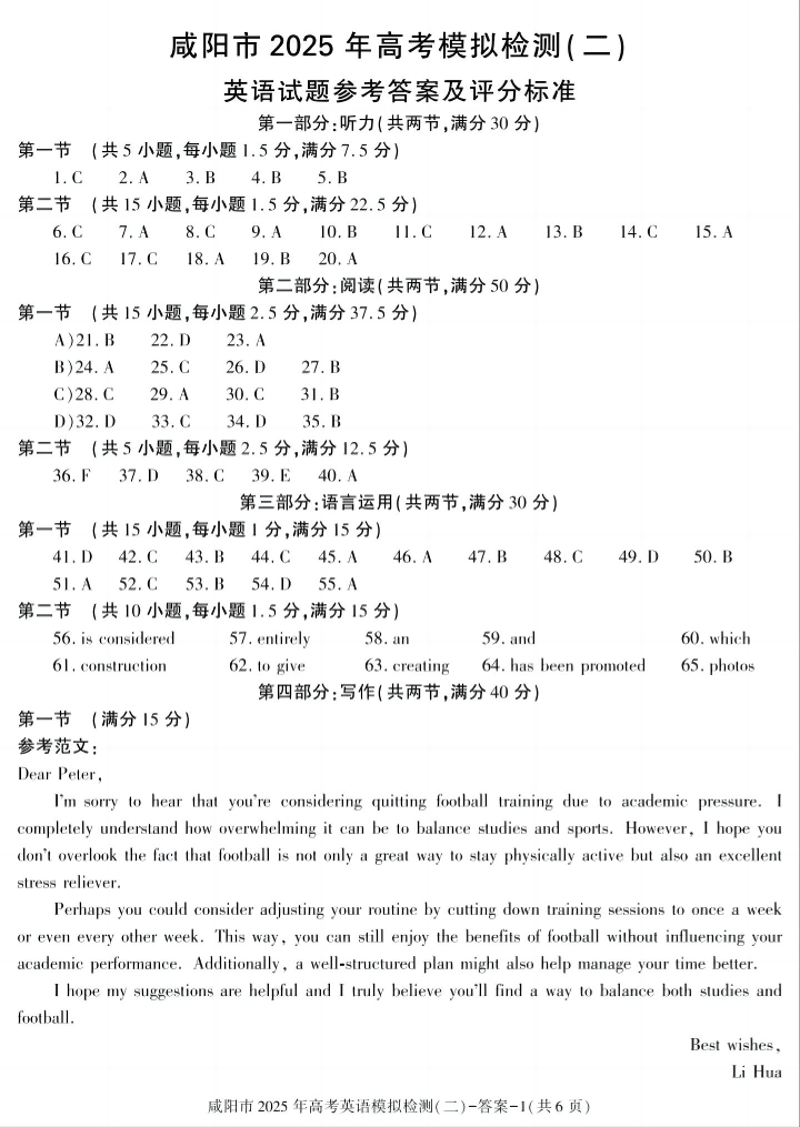 陕西省咸阳市2025年高考模拟检测(二)英语答案.pdf