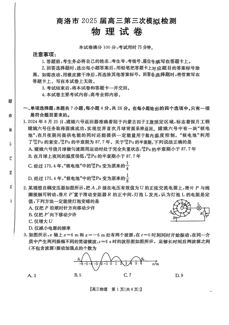 陕西省商洛市2025届高三下学期第三次模拟检测 物理(含答案).pdf