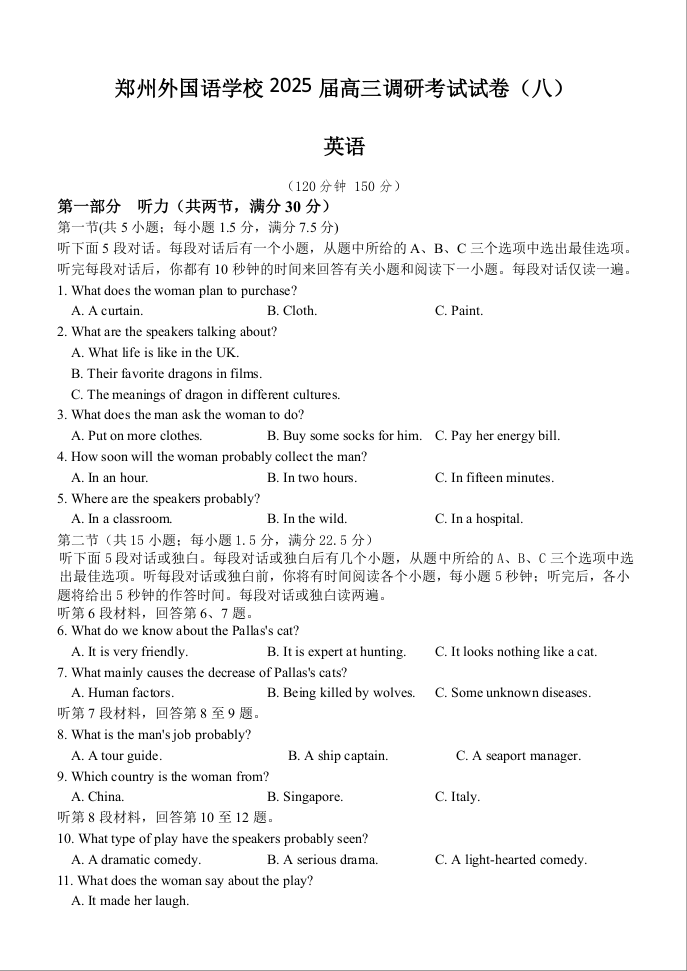郑州外国语学校2025届高三3月调研考试(八)英语(含答案).docx