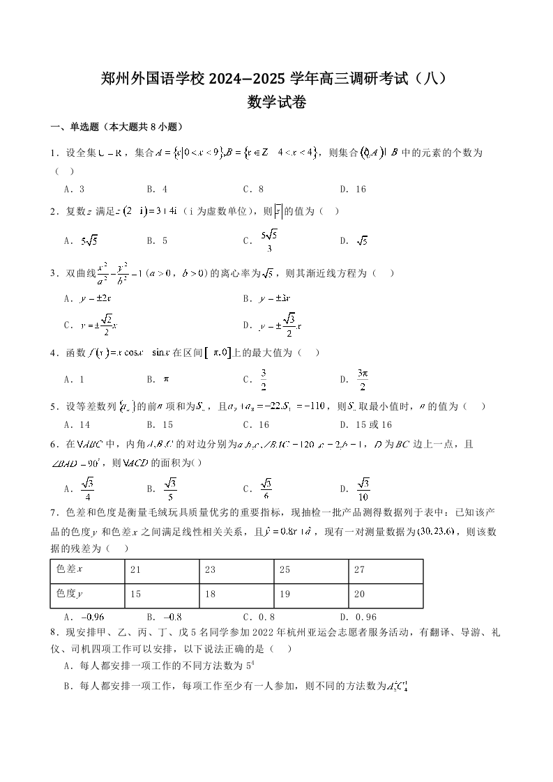郑州外国语学校2025届高三3月调研考试(八)数学(含答案).docx