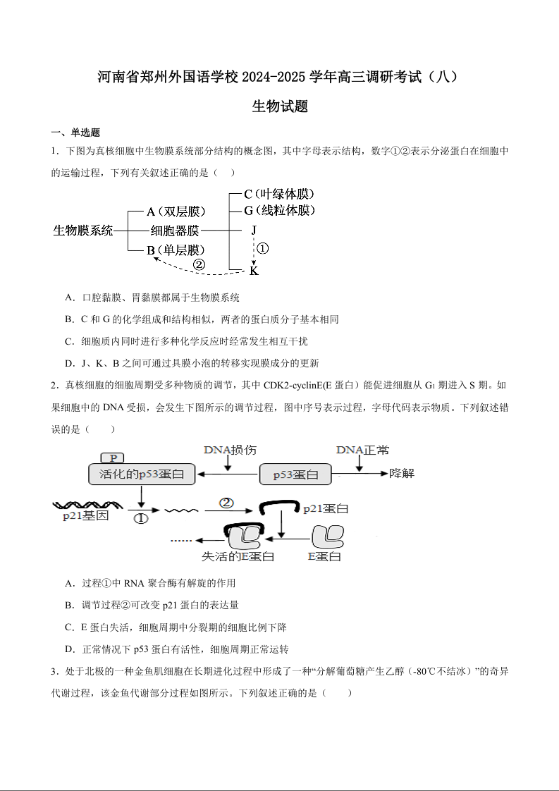 郑州外国语学校2025届高三3月调研考试(八)生物(含答案).docx