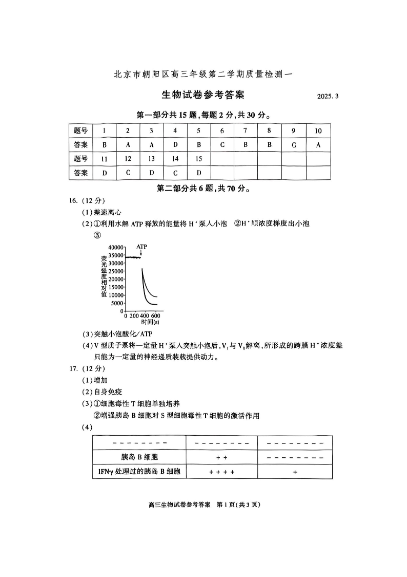 北京市朝阳区2025年高三年级第二学期质量检测一 生物答案.pdf