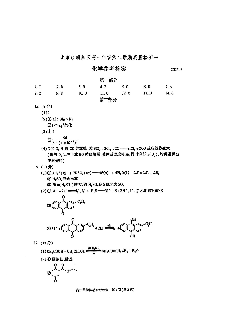 北京市朝阳区2025年高三年级第二学期质量检测一 化学答案.pdf