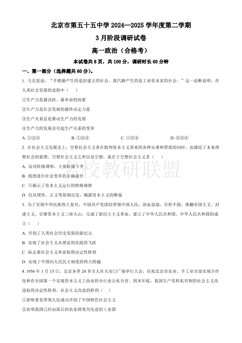 北京市第五十五中学2024-2025学年高一下学期3月阶段性调研试卷 政治(含答案).pdf