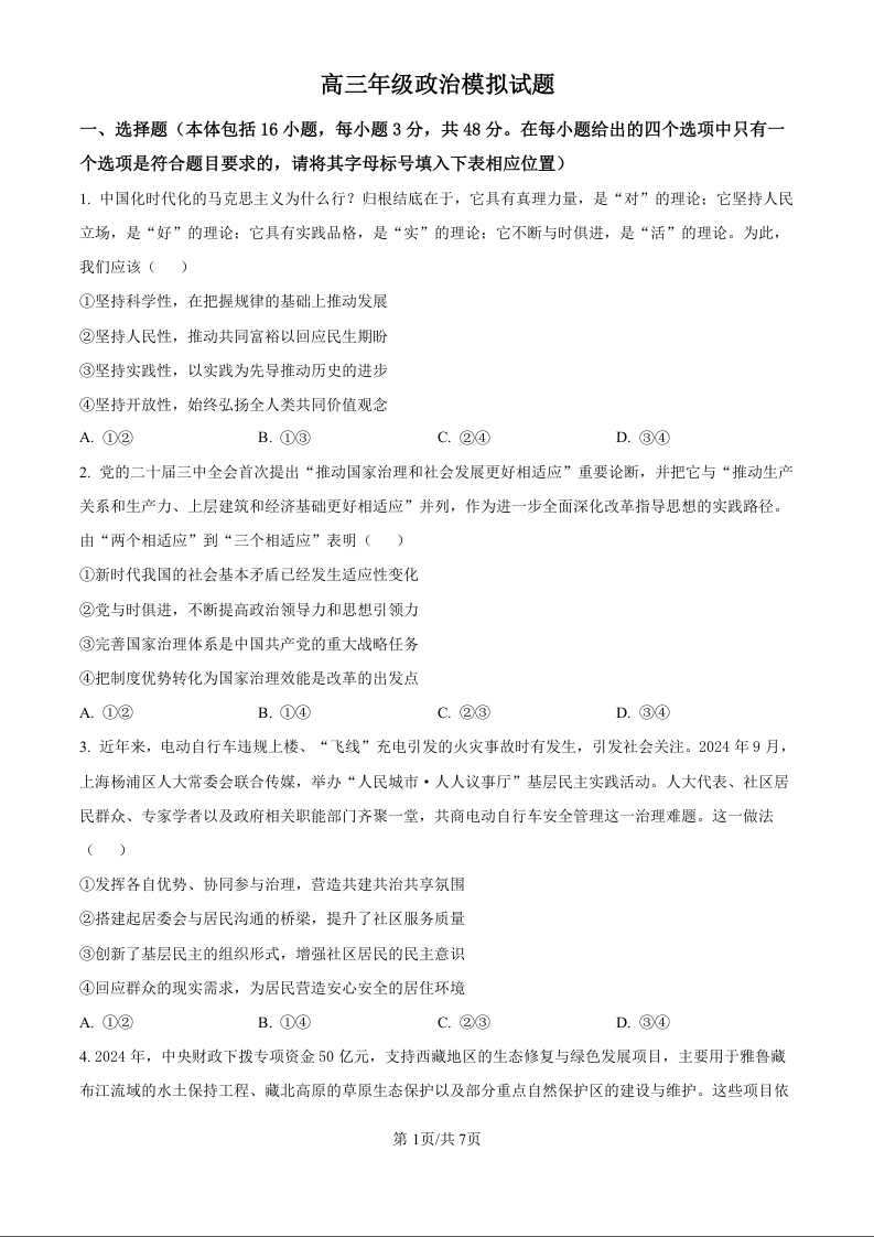 山西大学附属中学校2024-2025学年高三下学期3月月考 政治.docx