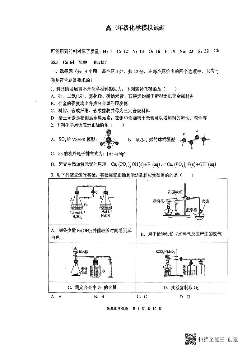 山西大学附属中学校2024-2025学年高三下学期3月月考 化学.pdf
