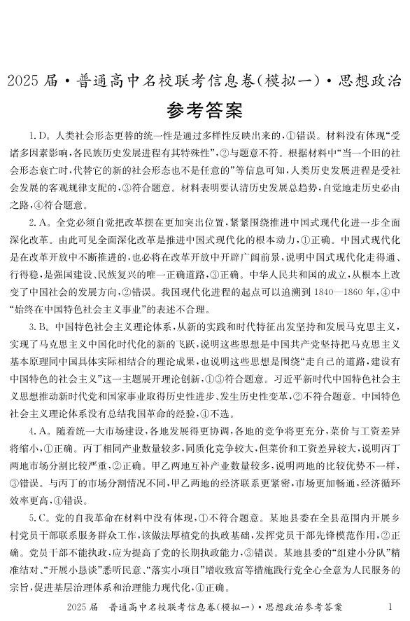 湖南省2025届普通高中名校联考信息卷(模拟一)政治答案.pdf