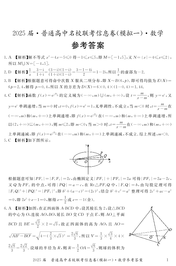 湖南省2025届普通高中名校联考信息卷(模拟一)数学答案.pdf