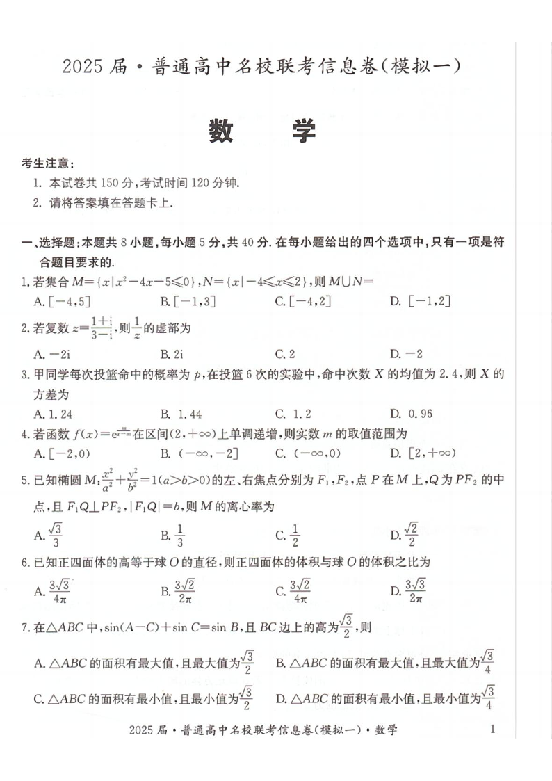湖南省2025届普通高中名校联考信息卷(模拟一)数学.pdf