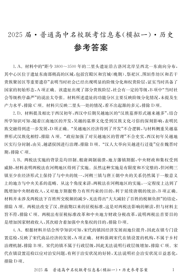 湖南省2025届普通高中名校联考信息卷(模拟一)历史答案.pdf