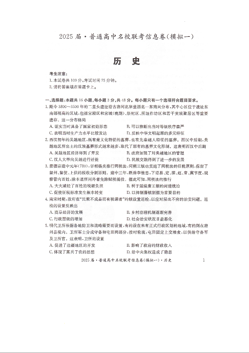 湖南省2025届普通高中名校联考信息卷(模拟一)历史.docx