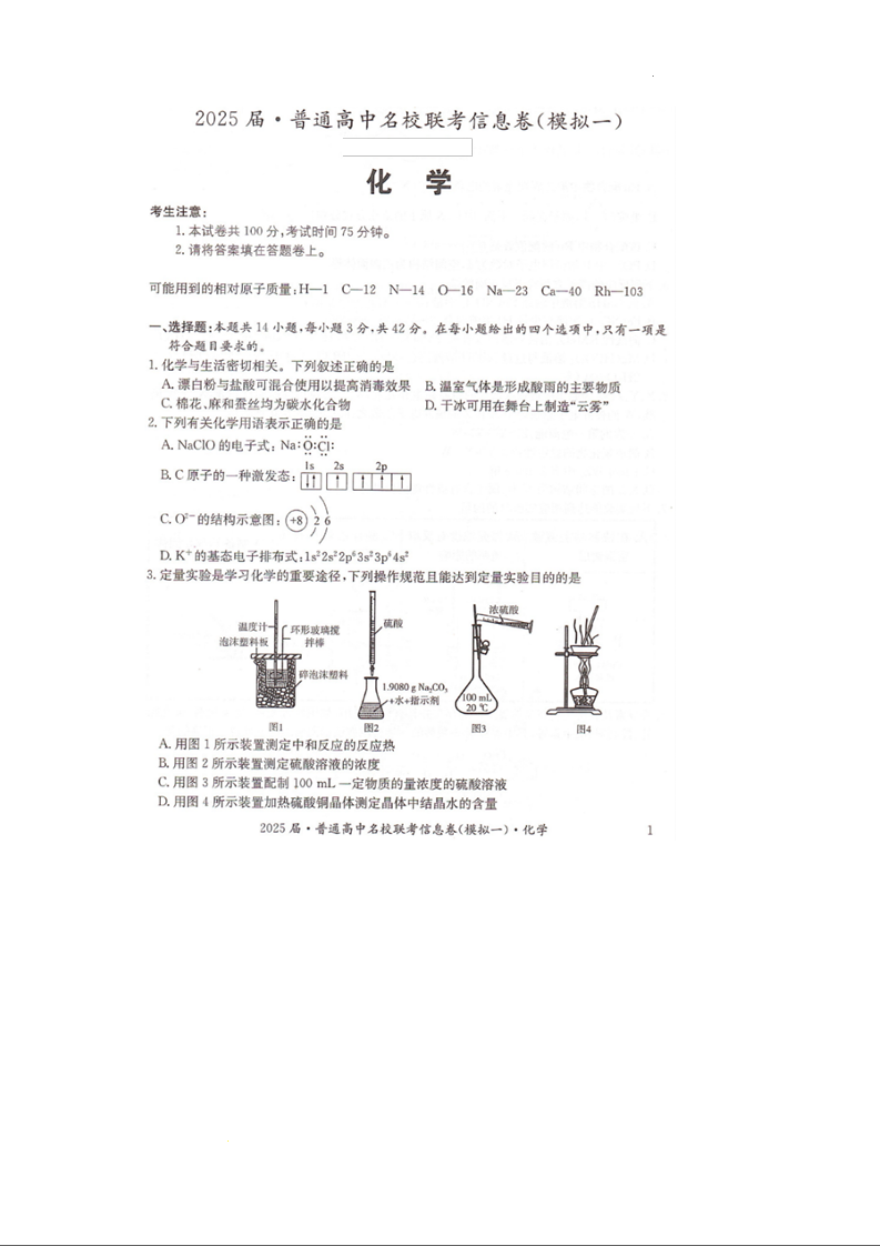 湖南省2025届普通高中名校联考信息卷(模拟一)化学.docx