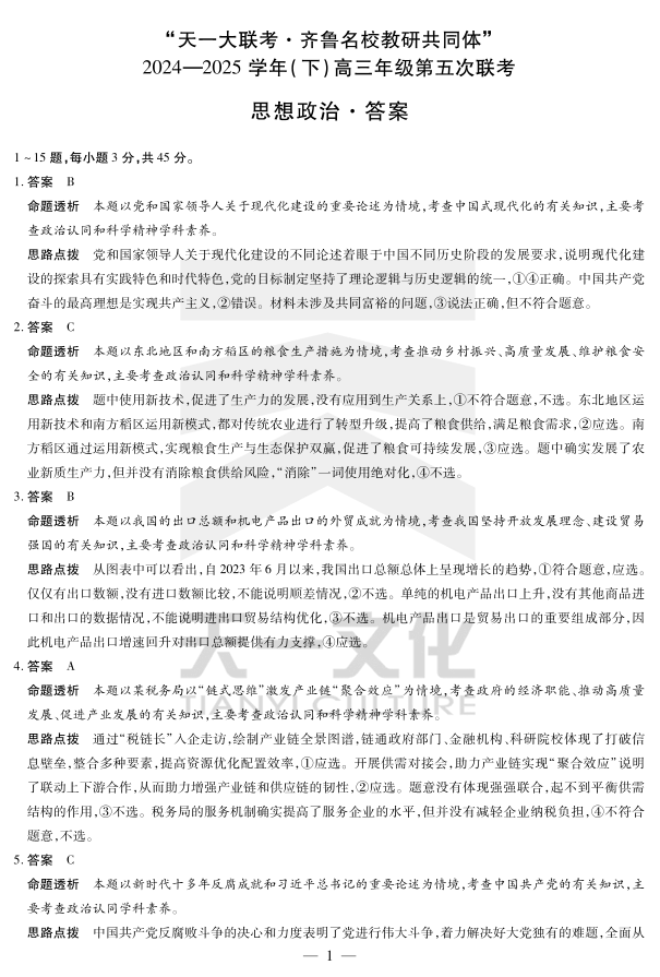 山东省齐鲁名校教研体2024-2025学年(下)高三年级第五次联考 政治答案.pdf