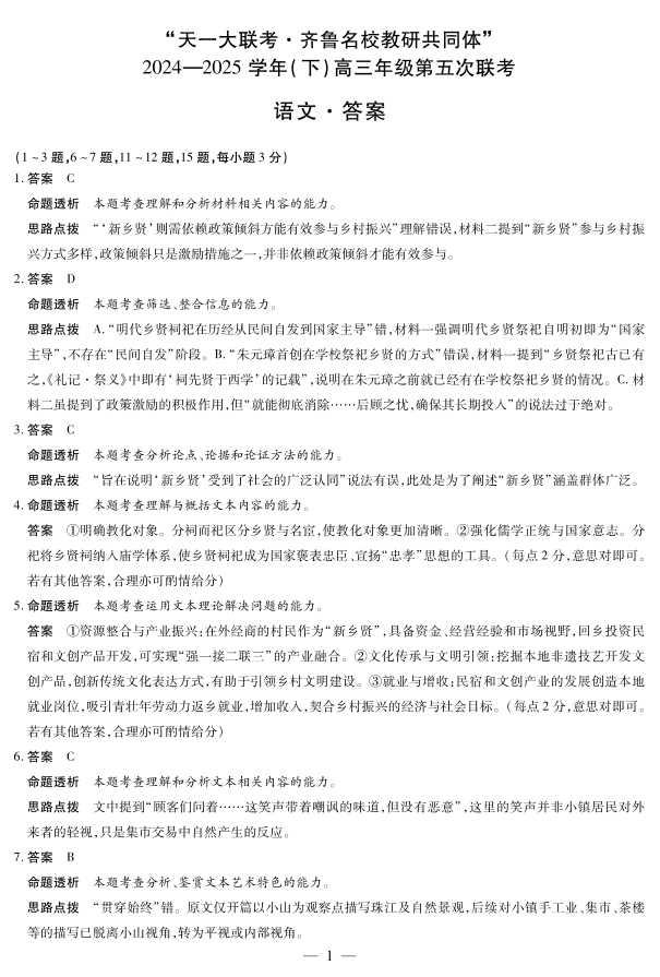 山东省齐鲁名校教研体2024-2025学年(下)高三年级第五次联考 语文答案.pdf