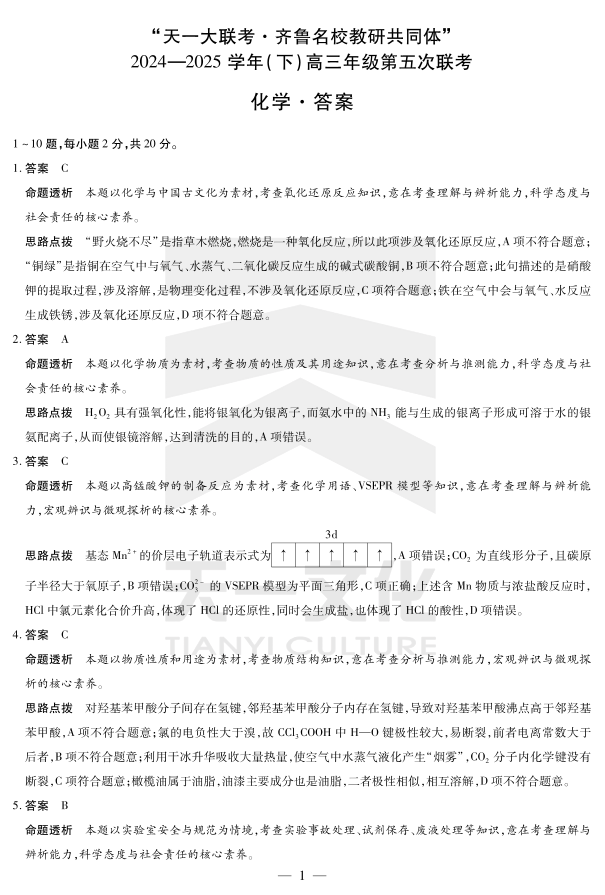 山东省齐鲁名校教研体2024-2025学年(下)高三年级第五次联考 化学答案.pdf