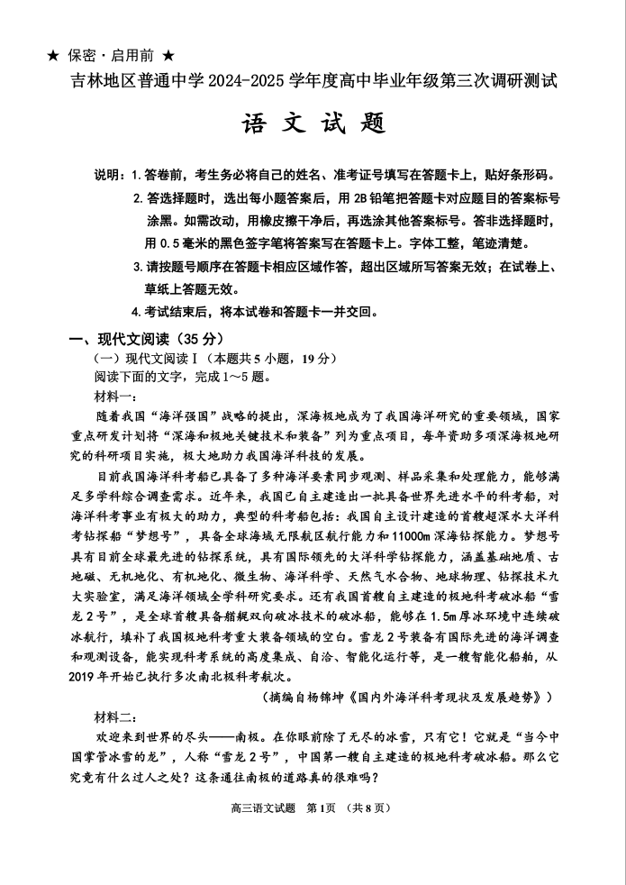 吉林地区普通中学2025届高中毕业年级第三次调研测试 语文.doc