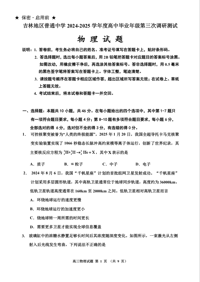 吉林地区普通中学2025届高中毕业年级第三次调研测试 物理.doc