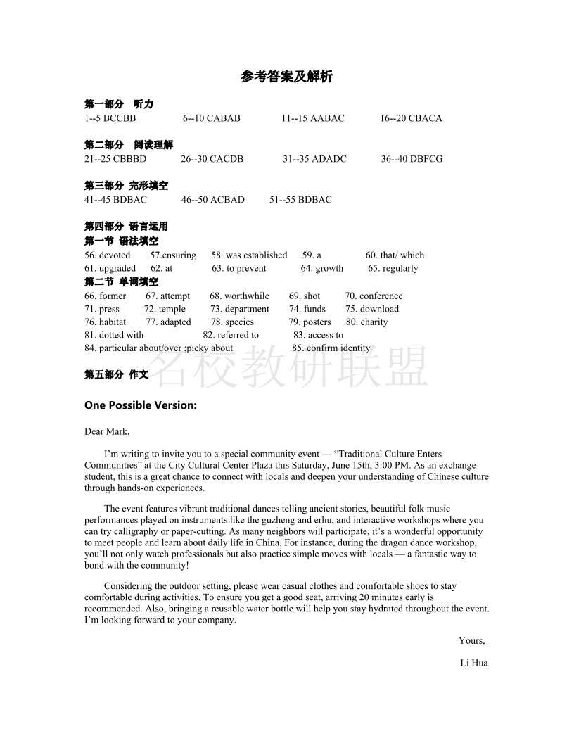 重庆市万州二中2024-2025学年高一下学期3月月考 英语答案.pdf