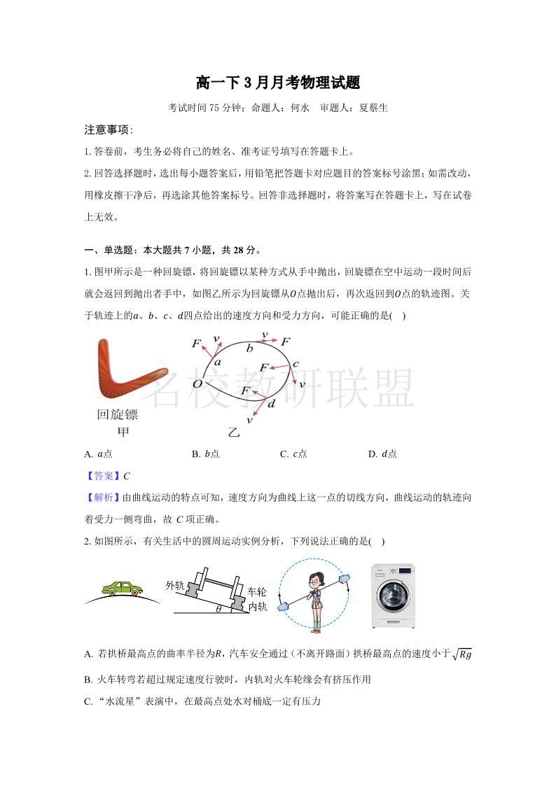 重庆市万州二中2024-2025学年高一下学期3月月考 物理答案.pdf