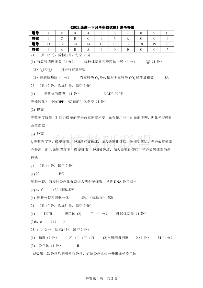 重庆市万州二中2024-2025学年高一下学期3月月考 生物答案.pdf
