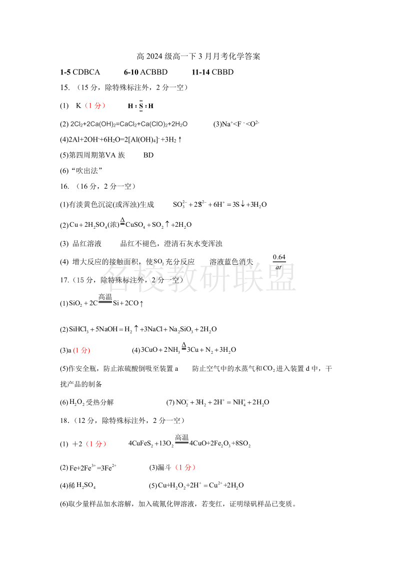 重庆市万州二中2024-2025学年高一下学期3月月考 化学答案.pdf