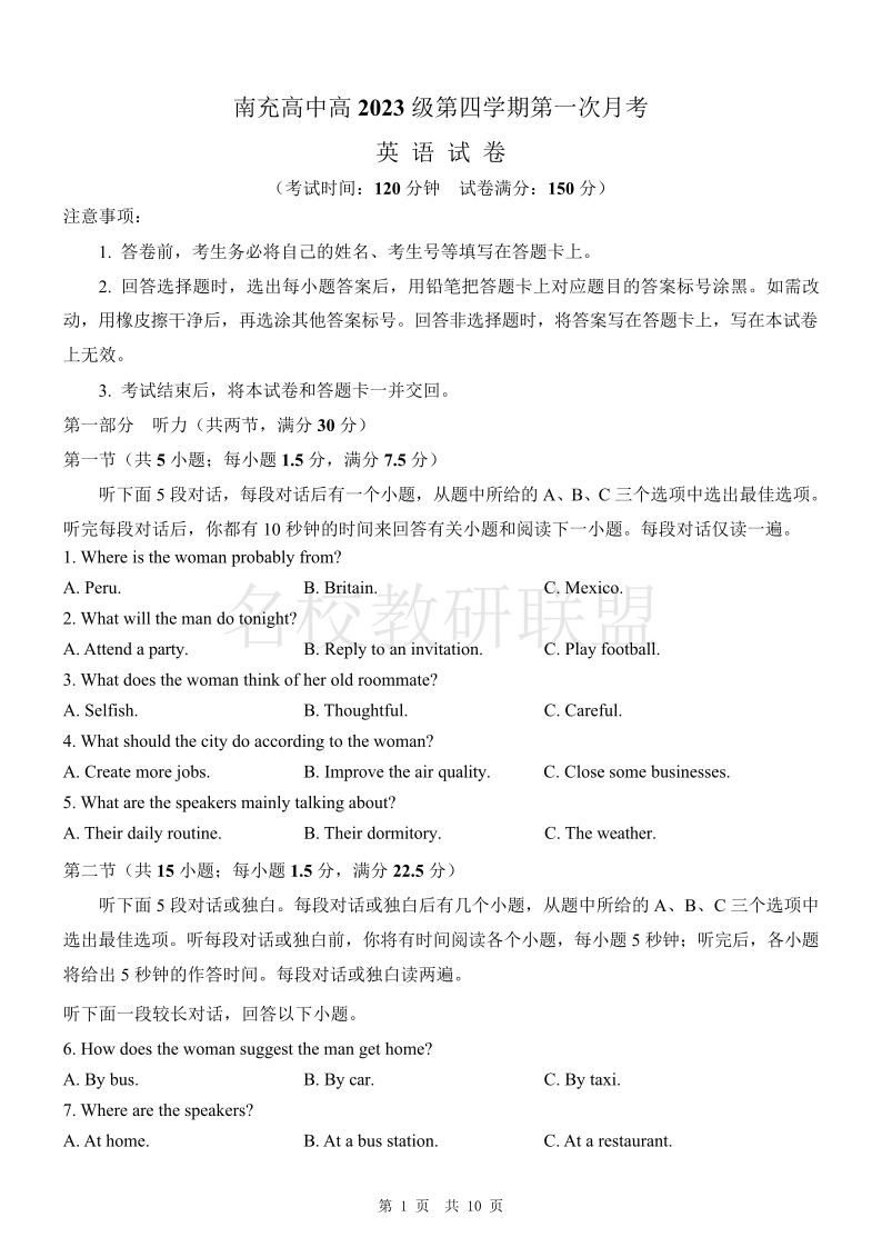 南充高中高2023级第四学期第一次月考 英语.pdf
