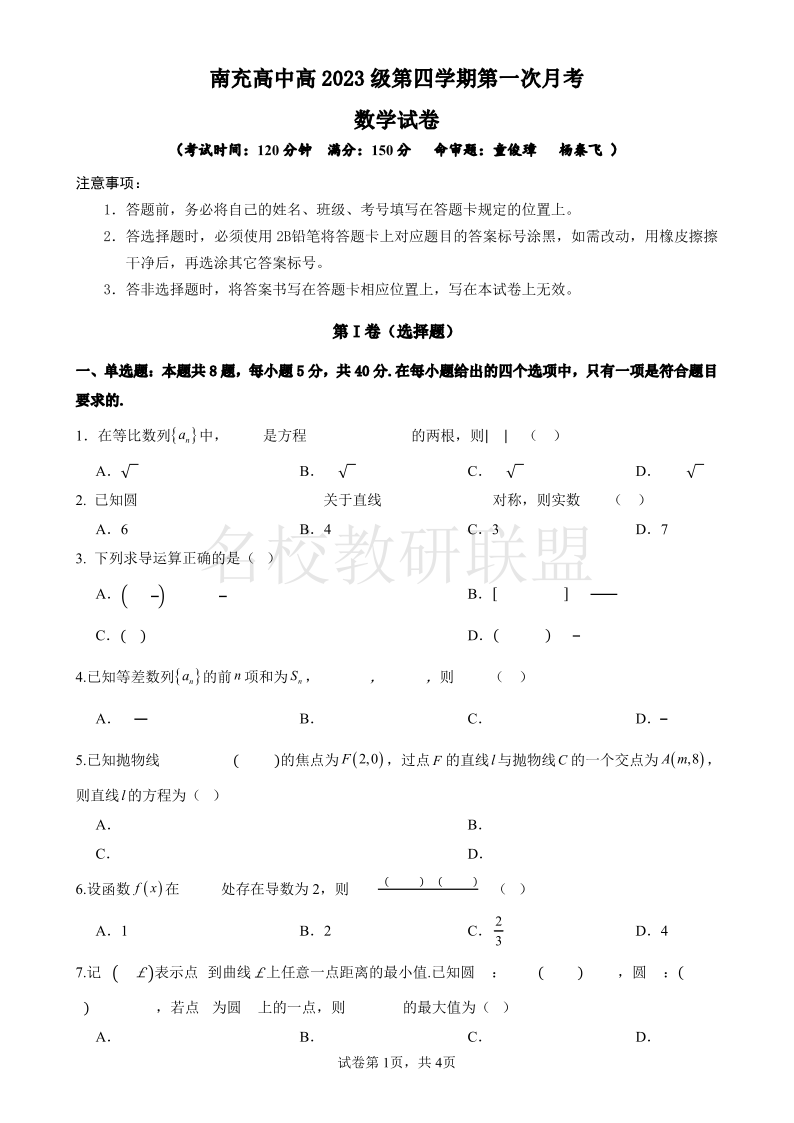 南充高中高2023级第四学期第一次月考 数学.pdf