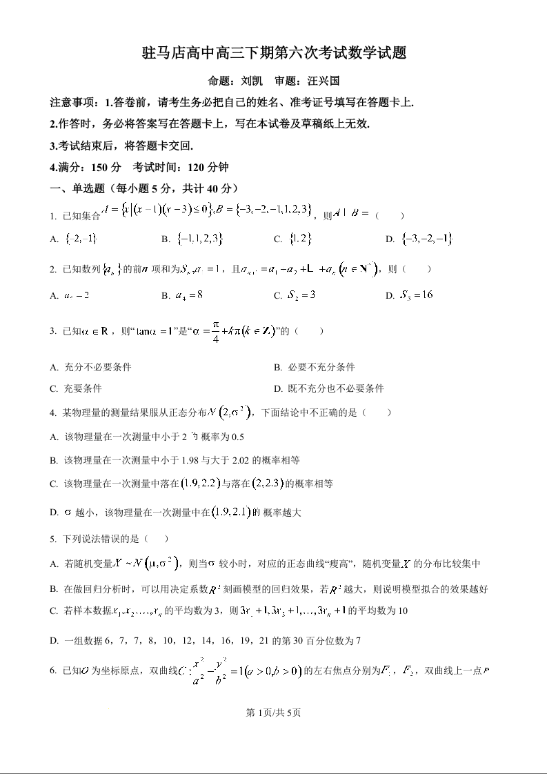 河南省驻马店高级中学2025届高三下学期4月月考 数学.docx