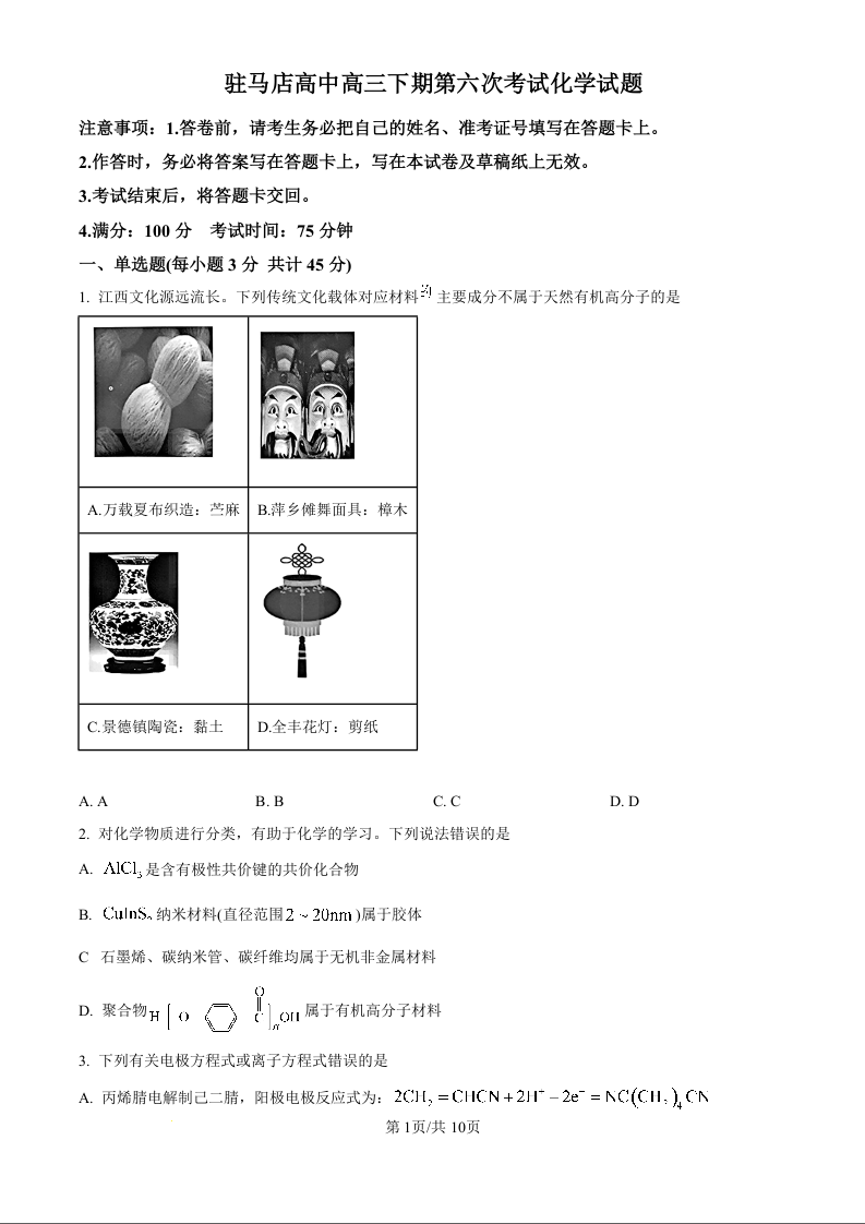 河南省驻马店高级中学2025届高三下学期4月月考 化学.docx