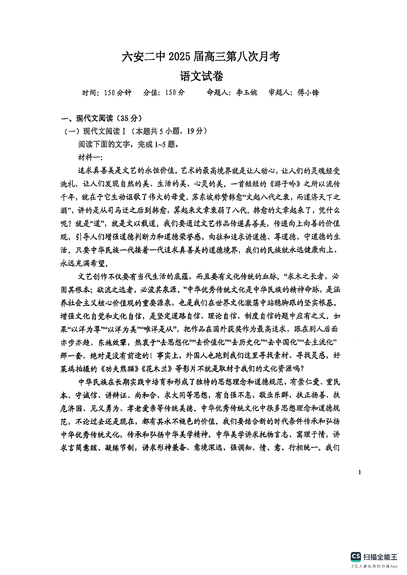安徽省六安二中2025届高三3月第八次月考 语文(含答案).pdf