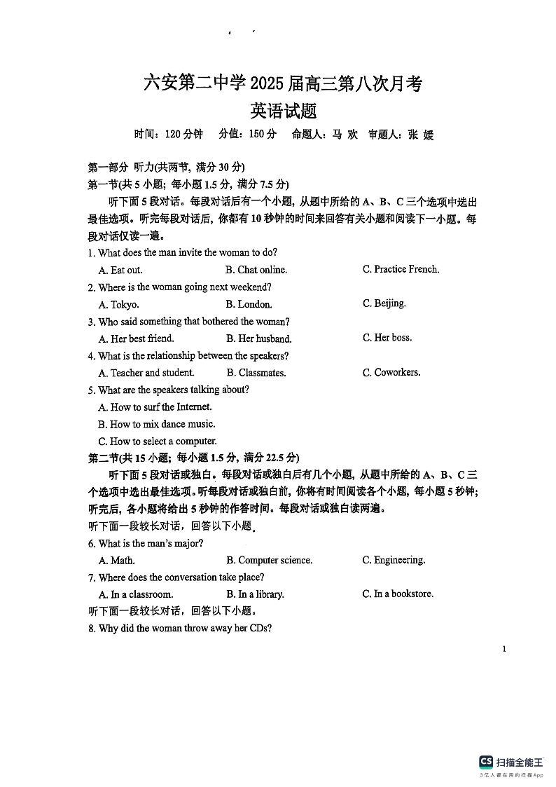安徽省六安二中2025届高三3月第八次月考 英语(含答案).pdf