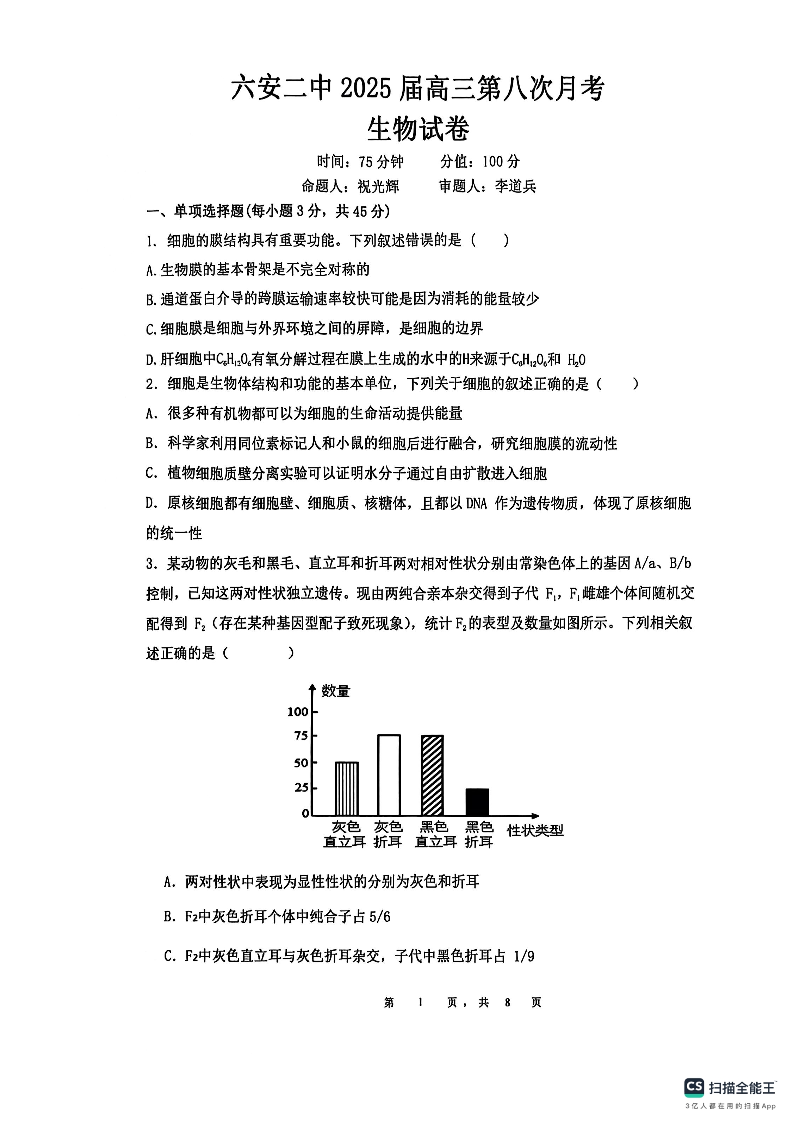 安徽省六安二中2025届高三3月第八次月考 生物(含答案).pdf