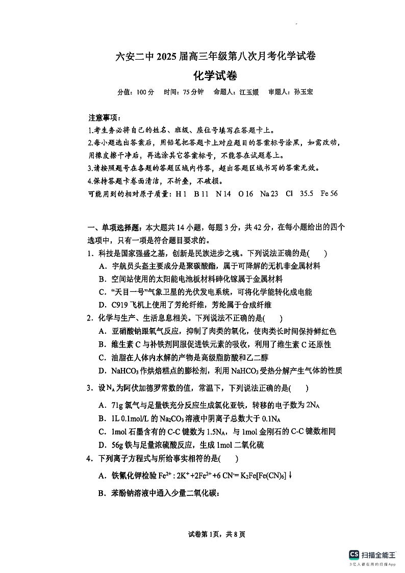 安徽省六安二中2025届高三3月第八次月考 化学(含答案).pdf