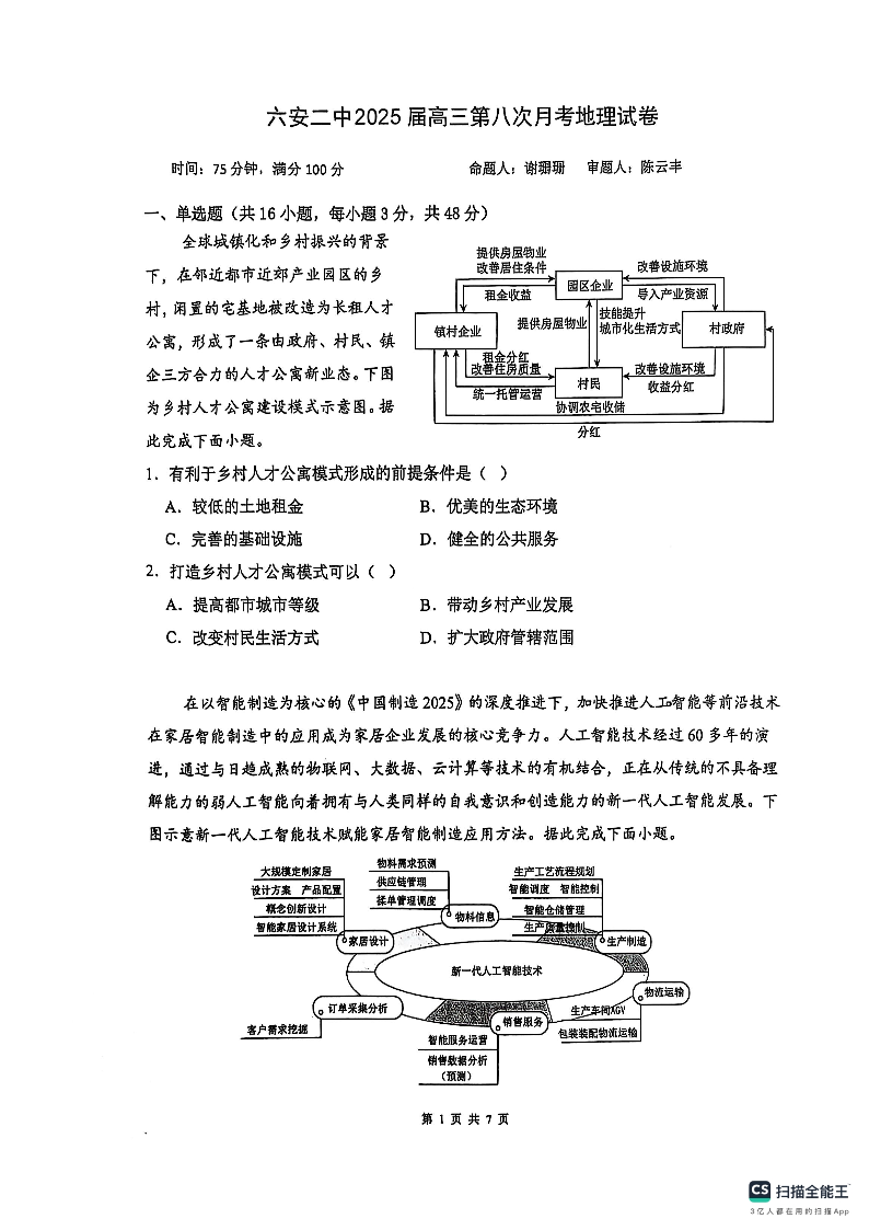 安徽省六安二中2025届高三3月第八次月考 地理(含答案).pdf