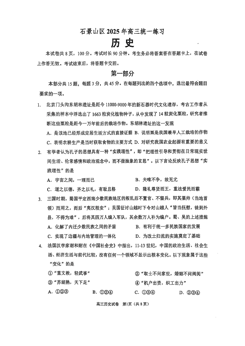 2025北京石景山高三一模 历史(含答案).pdf