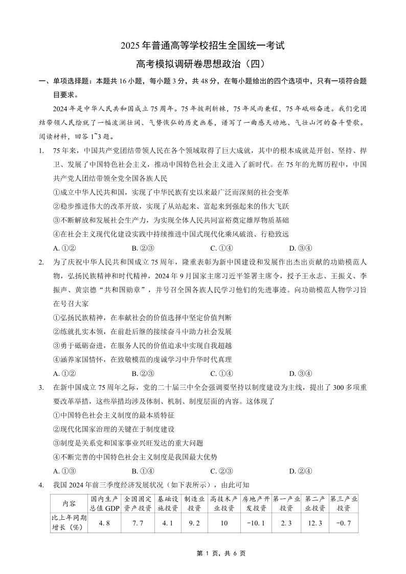 重庆市2025年普通高等学校招生全国统一考试康德调研(四)政治.pdf