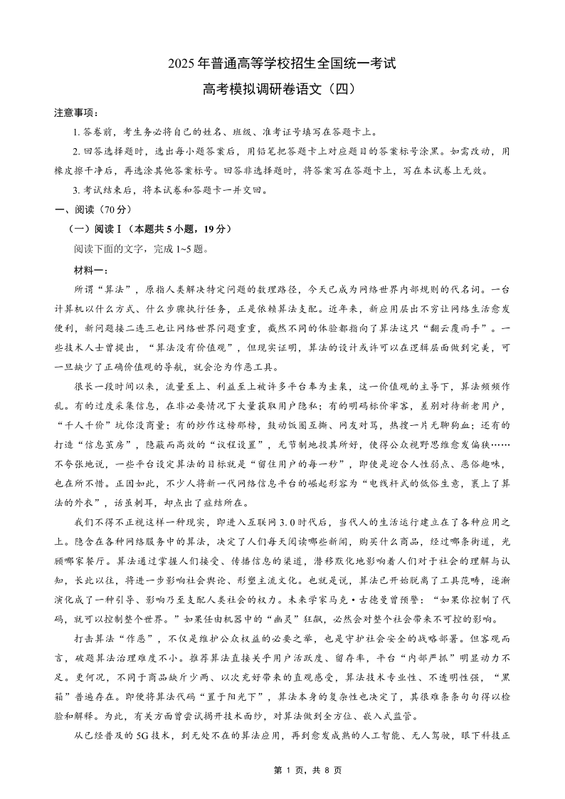 重庆市2025年普通高等学校招生全国统一考试康德调研(四)语文.pdf