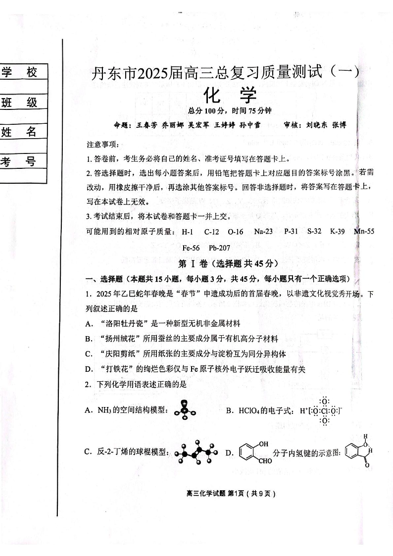 辽宁省丹东市2025届高三3月总复习质量测试(一)化学(含答案).pdf