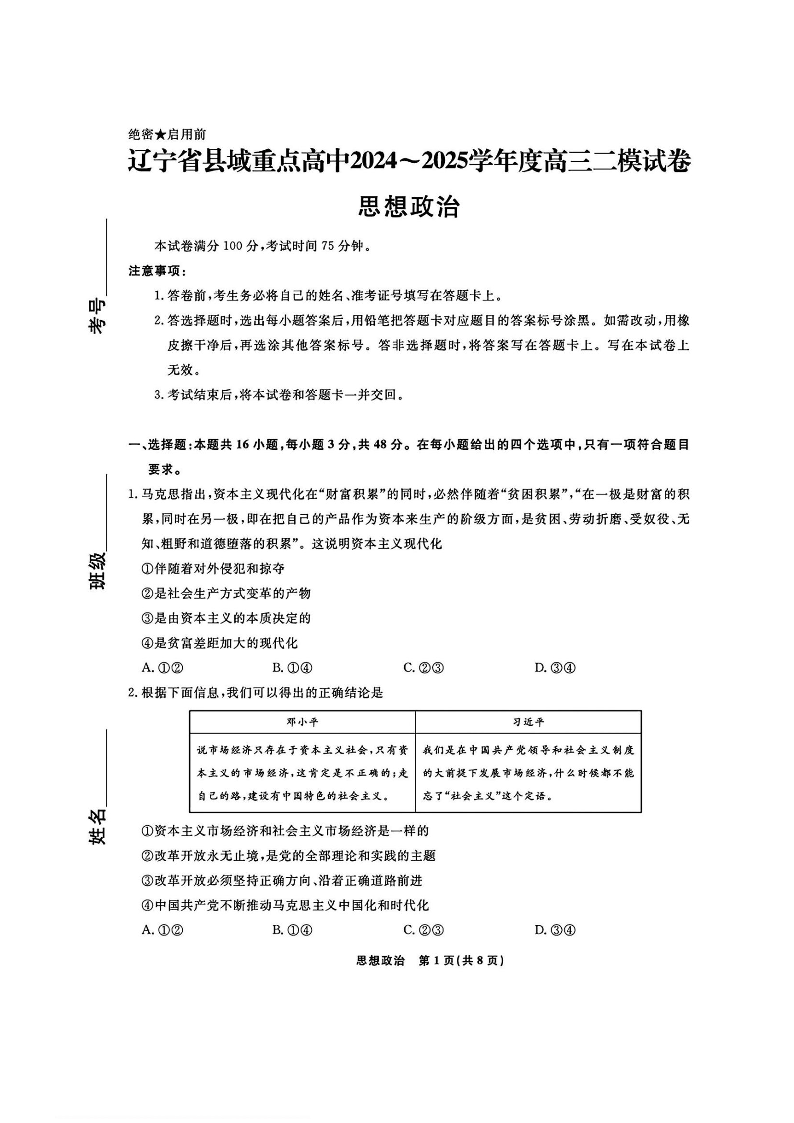 辽宁省县域重点高中2024-2025学年度高三二模试卷 政治(含答案).pdf