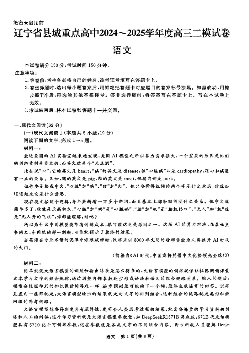 辽宁省县域重点高中2024-2025学年度高三二模试卷 语文(含答案).pdf