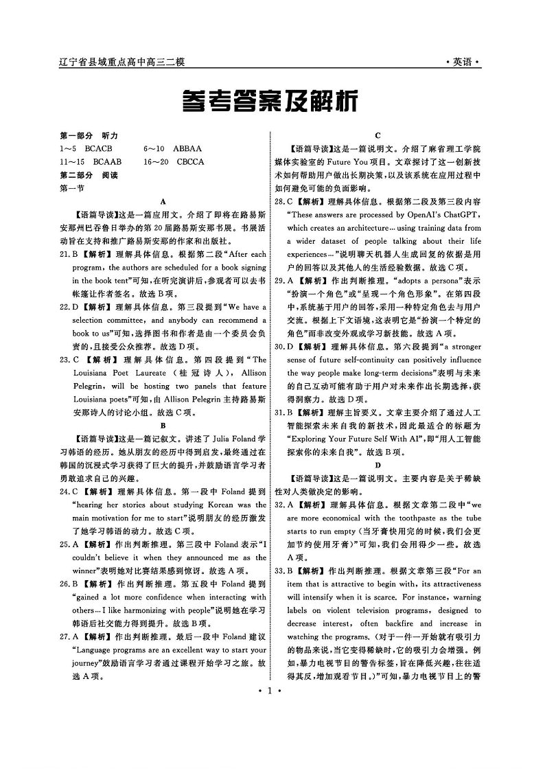 辽宁省县域重点高中2024-2025学年度高三二模试卷 英语答案.pdf