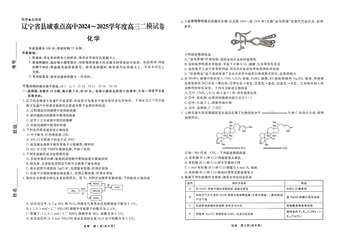 辽宁省县域重点高中2024-2025学年度高三二模试卷 化学.pdf