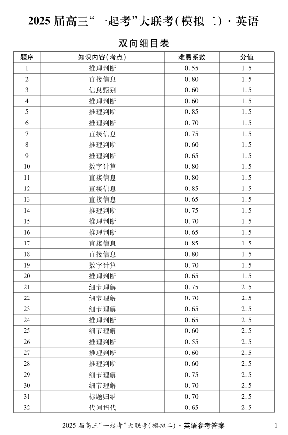 湖南省2025届高三下学期“一起考”大联考(模拟二)英语答案.pdf