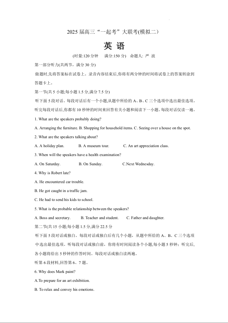 湖南省2025届高三下学期“一起考”大联考(模拟二)英语.docx