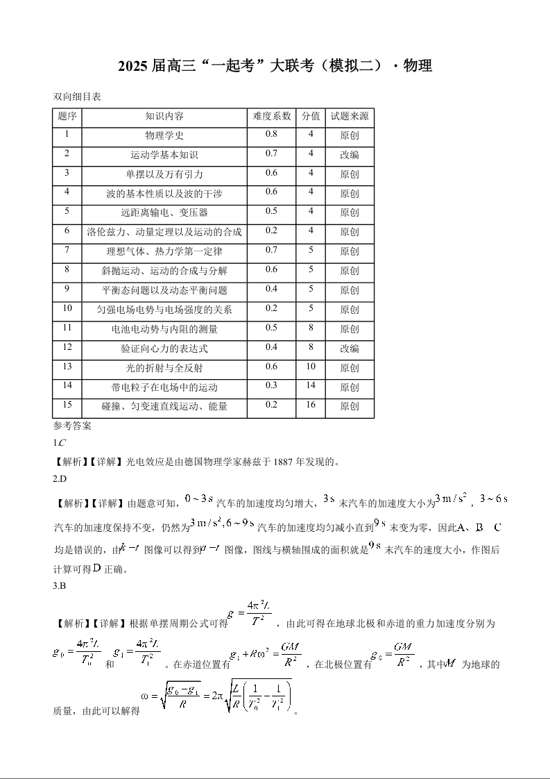 湖南省2025届高三下学期“一起考”大联考(模拟二)物理答案.docx