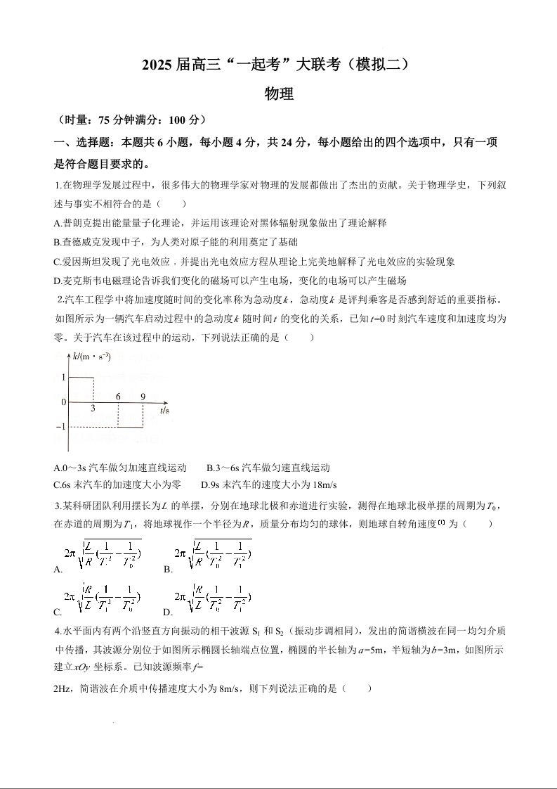 湖南省2025届高三下学期“一起考”大联考(模拟二)物理.docx