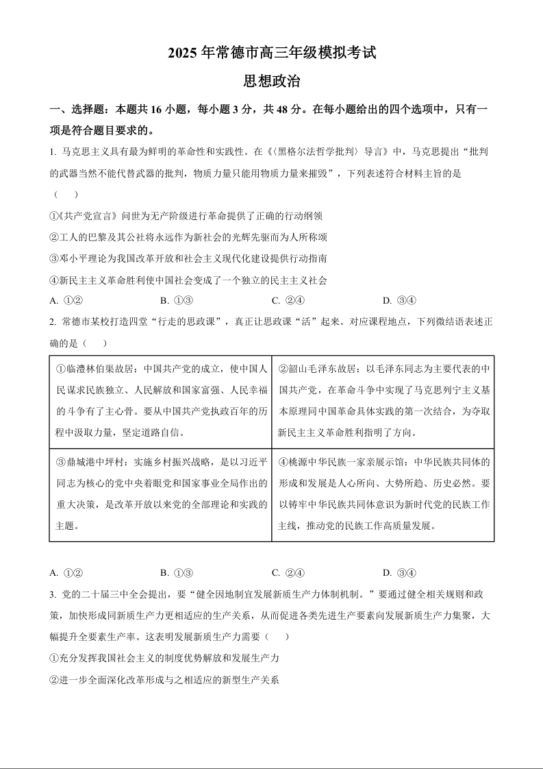湖南省2025年常德市高三年级模拟考试(二模)政治(含答案).docx
