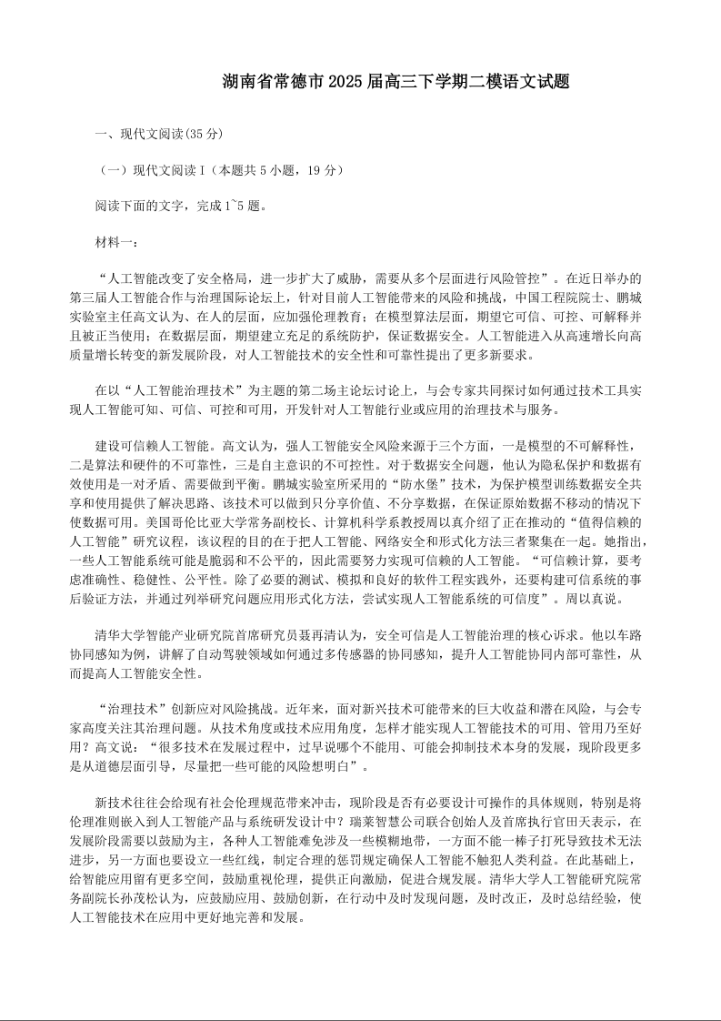 湖南省2025年常德市高三年级模拟考试(二模)语文(含答案).docx