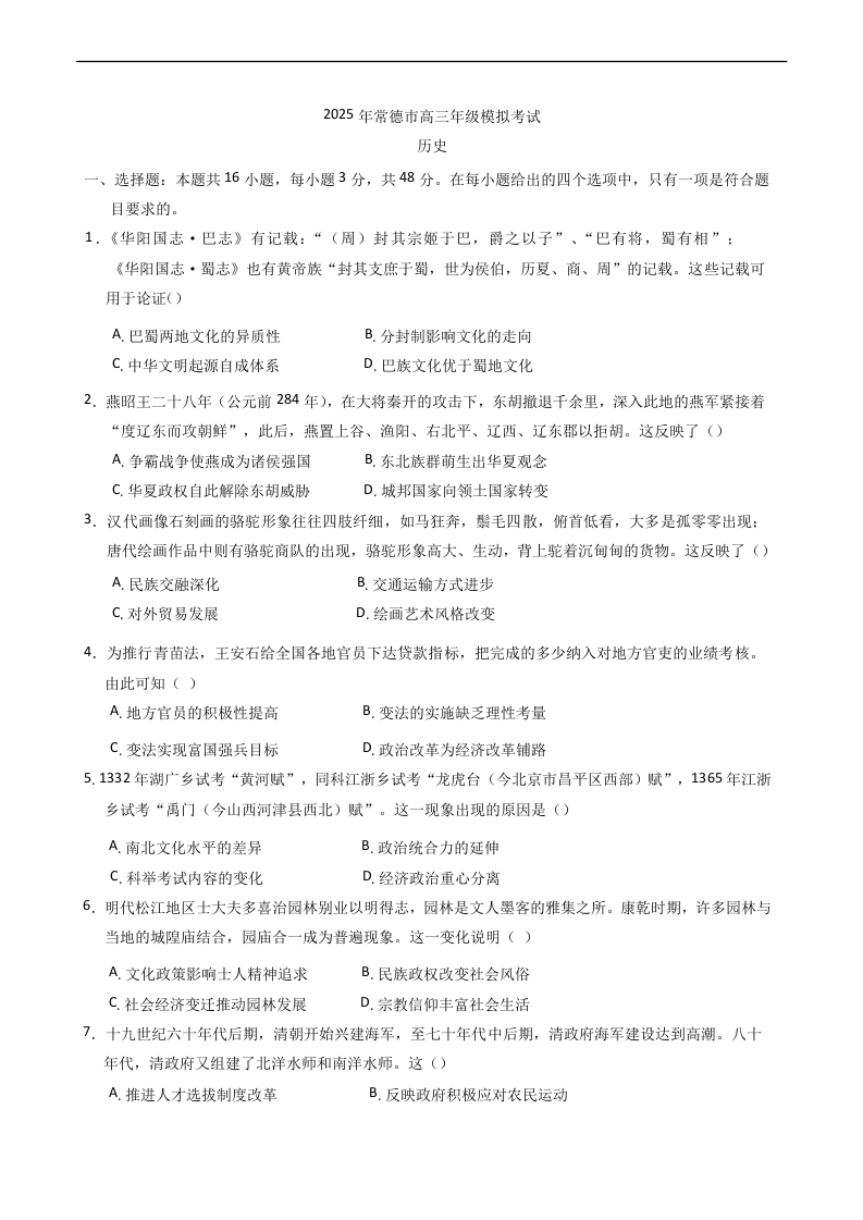 湖南省2025年常德市高三年级模拟考试(二模)历史(含答案).docx